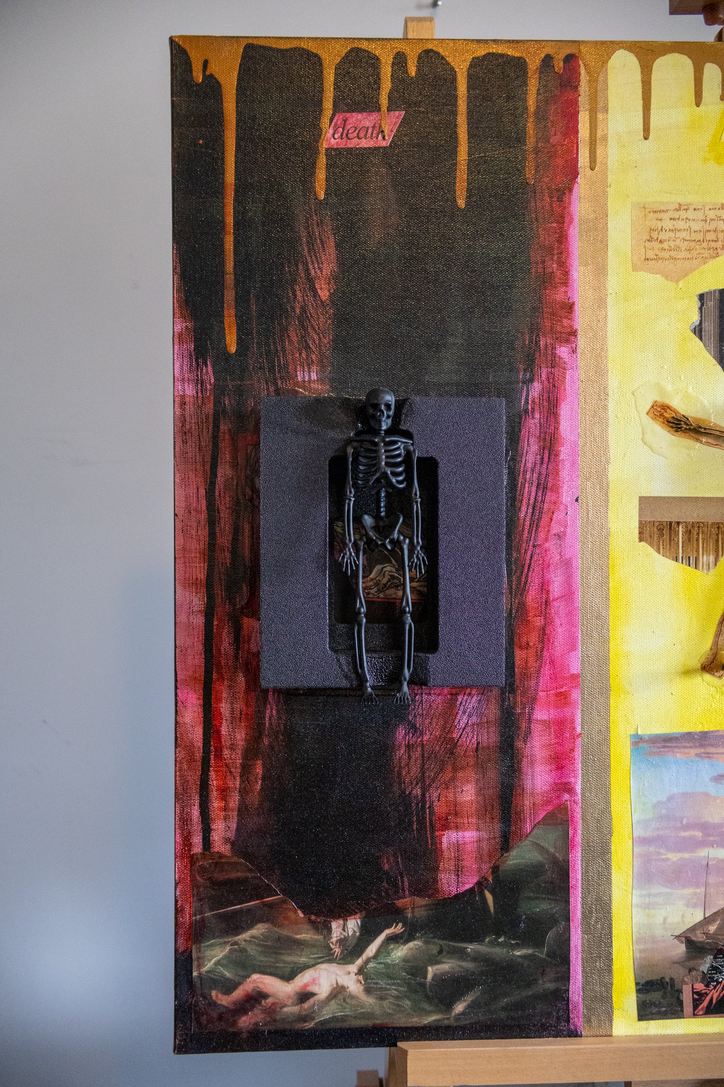 This piece was created with hot glue, modgepodge, two plastic skeletons, foam case, various paper clippings, gold spray paint, gold paint, red, yellow and blue paint, decorative mask.